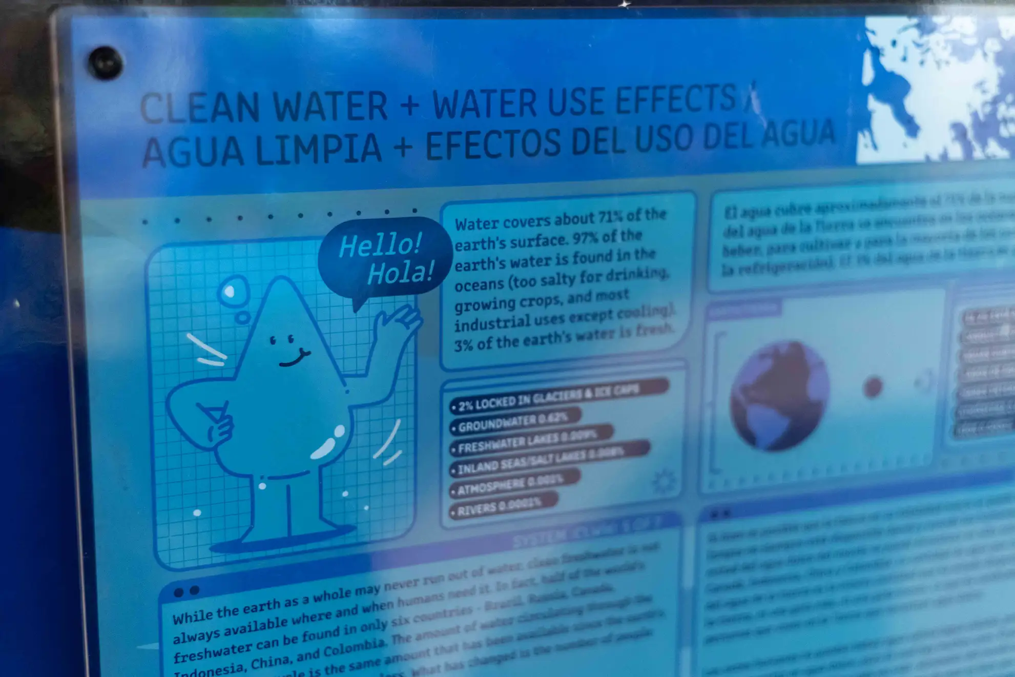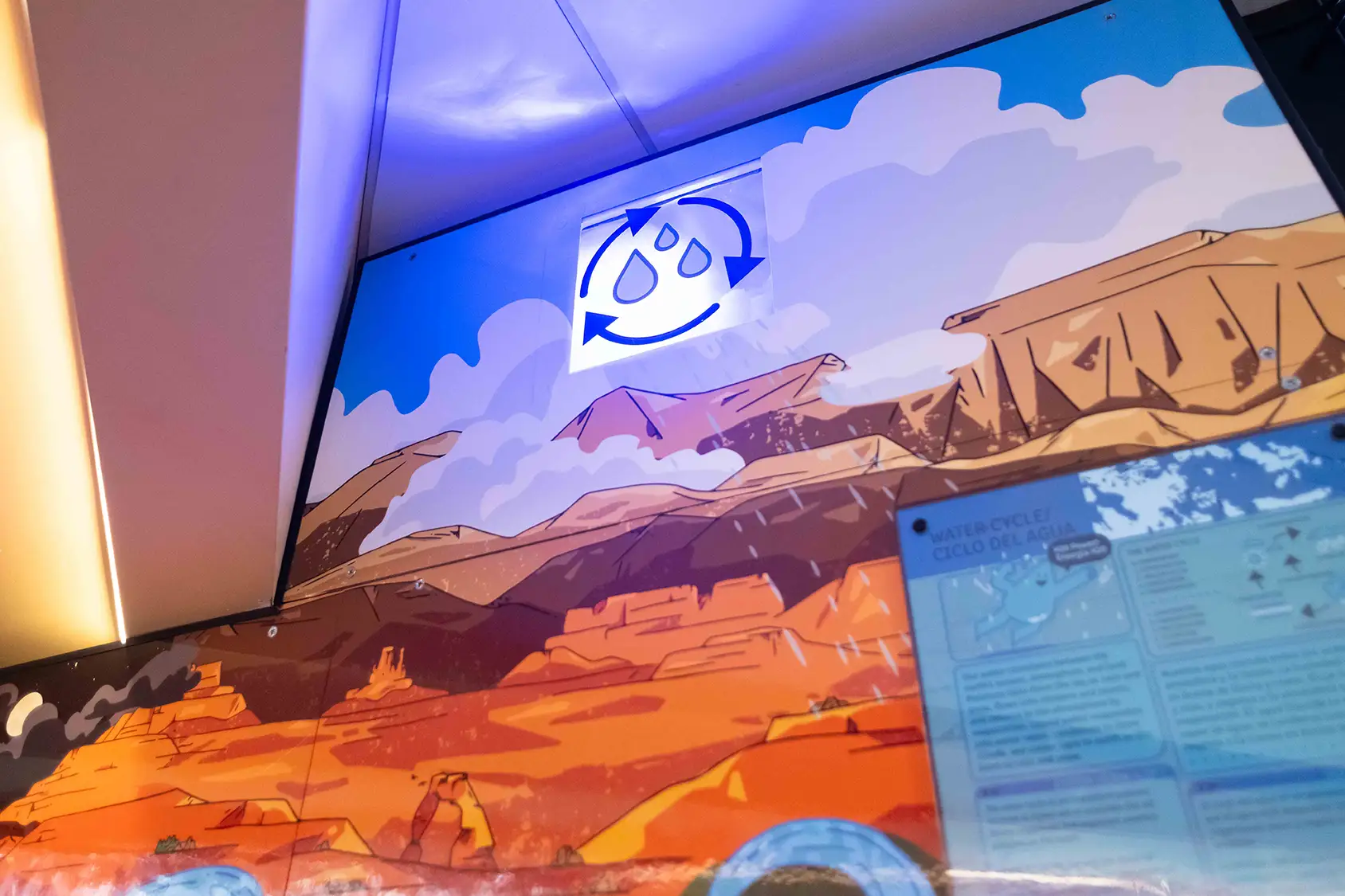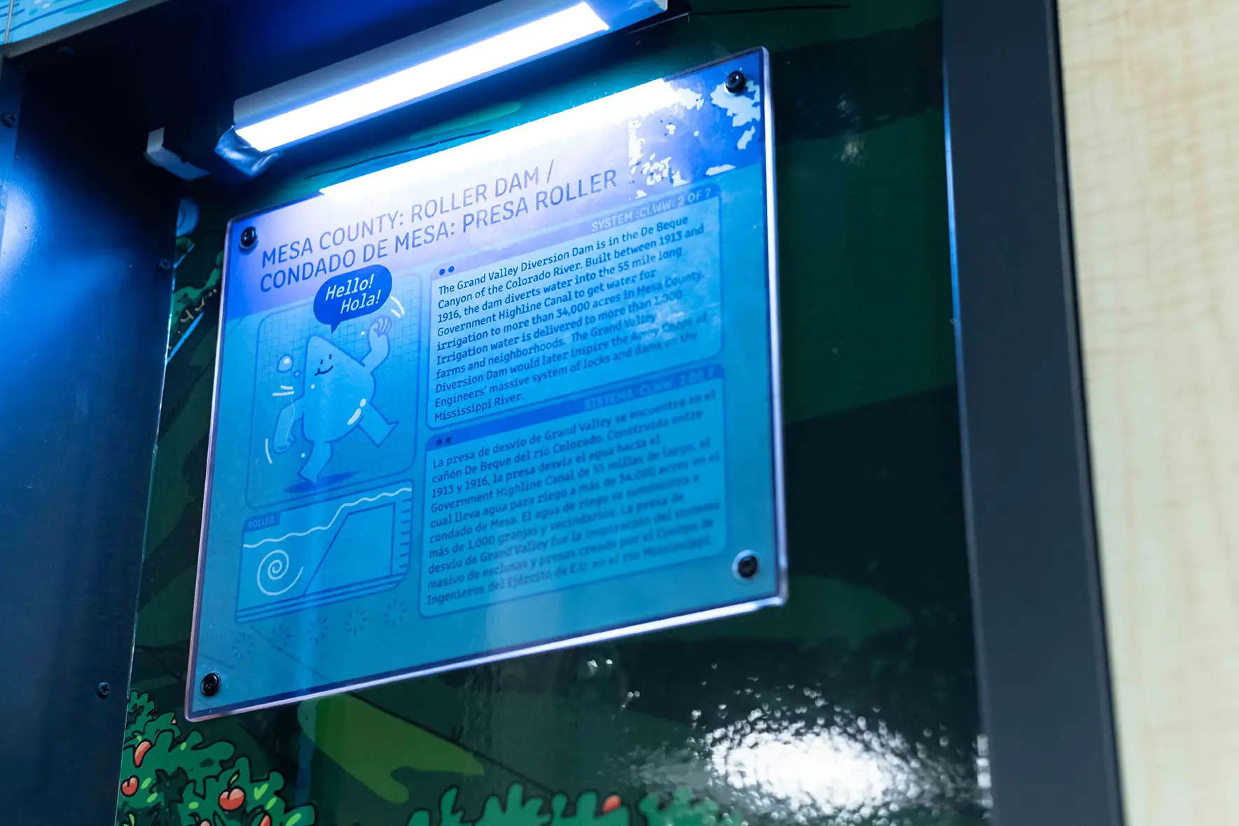The Clifton Libraries Water Wall is an immersive, interactive exhibit that tells the story of the Colorado River, tracing its journey from the Rocky Mountains through the Grand Valley, into neighboring states, and finally back in time to the dinosaur age—a way to tie in the vast geological history of Western Colorado. Installed within the children’s section of the Mesa County Library, the wall is not just a visual storyteller but an interactive experience featuring sound, levers, and buttons that allow deeper exploration of the river’s significance. Visitors can press buttons to hear native bird calls, pull a lever to activate LED lights that mimic water flow and highlight the region’s intricate farm irrigation systems, and push another button to illuminate the Vegas skyline, powered by the Hoover Dam. A water drop character and bilingual informational panels in English and Spanish enhance accessibility, with text placed under plexiglass to reinforce the interactive and technological aspects of the exhibit. Together, these elements communicate the importance of water conservation and highlight the many reasons we must protect our rivers.