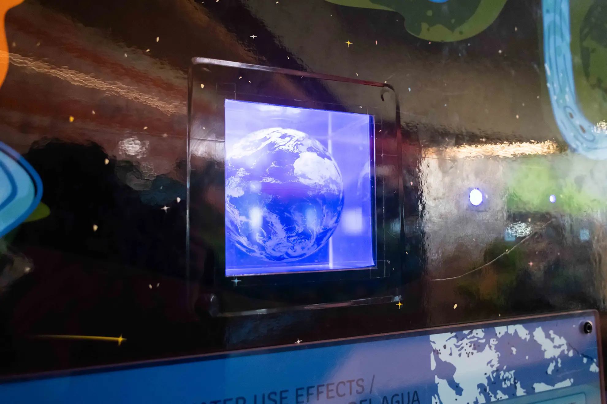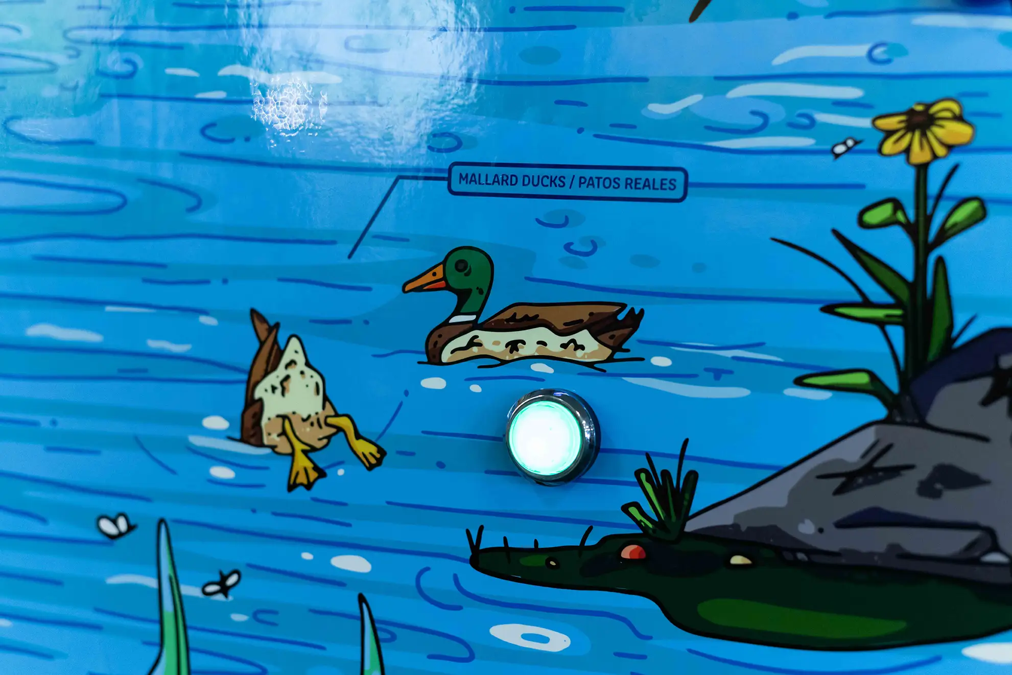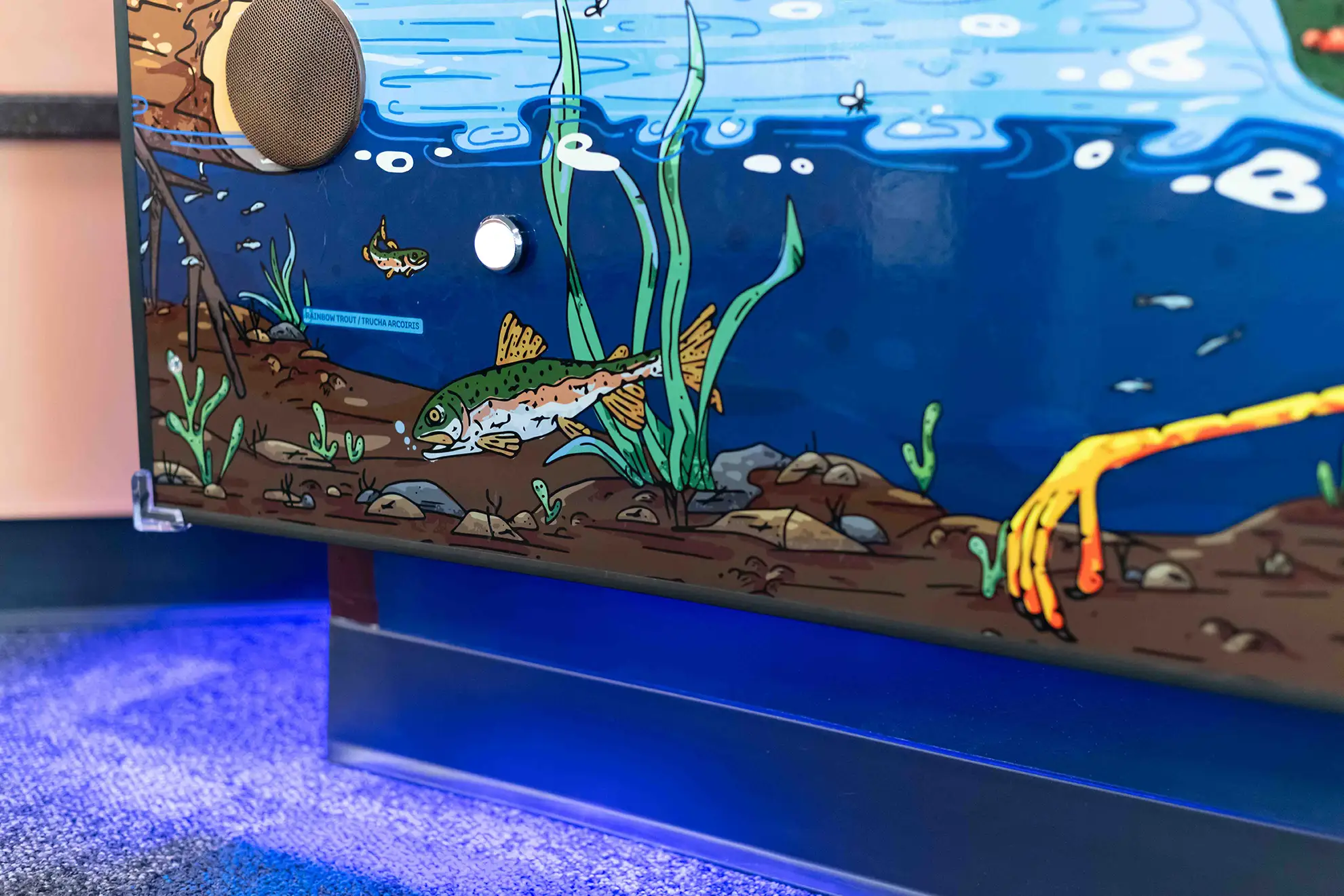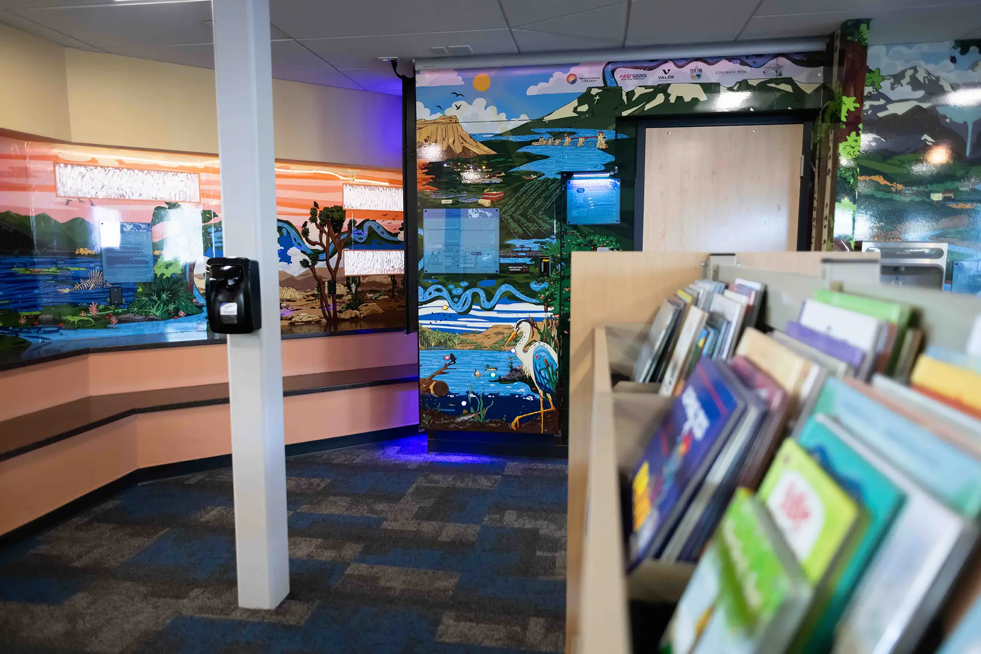 The Clifton Libraries Water Wall is an immersive, interactive exhibit that tells the story of the Colorado River, tracing its journey from the Rocky Mountains through the Grand Valley, into neighboring states, and finally back in time to the dinosaur age—a way to tie in the vast geological history of Western Colorado. Installed within the children’s section of the Mesa County Library, the wall is not just a visual storyteller but an interactive experience featuring sound, levers, and buttons that allow deeper exploration of the river’s significance. Visitors can press buttons to hear native bird calls, pull a lever to activate LED lights that mimic water flow and highlight the region’s intricate farm irrigation systems, and push another button to illuminate the Vegas skyline, powered by the Hoover Dam. A water drop character and bilingual informational panels in English and Spanish enhance accessibility, with text placed under plexiglass to reinforce the interactive and technological aspects of the exhibit. Together, these elements communicate the importance of water conservation and highlight the many reasons we must protect our rivers.