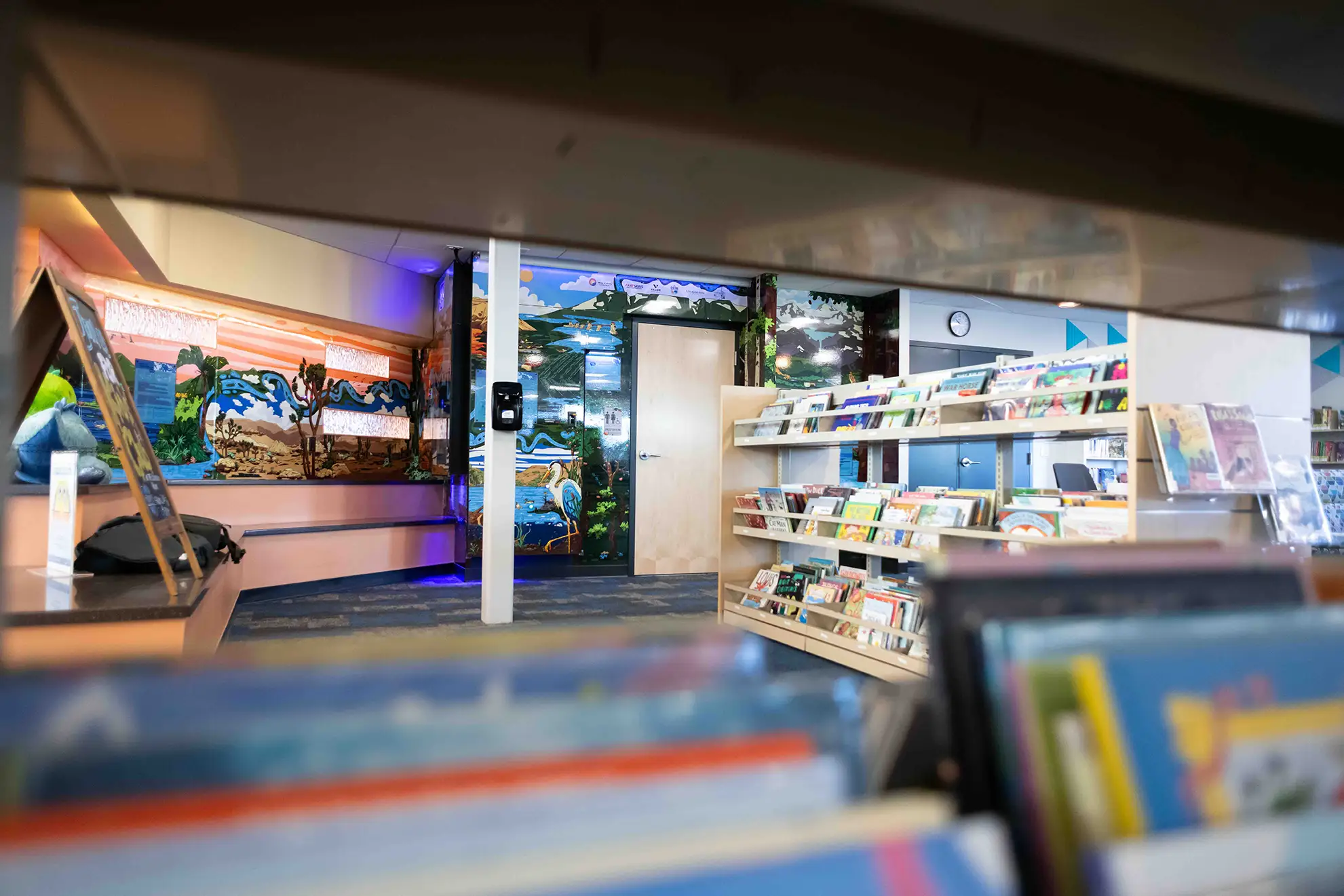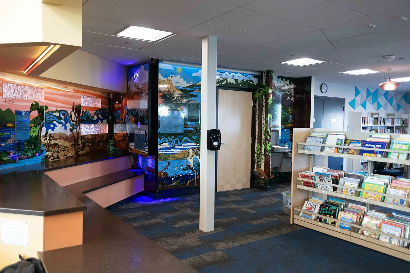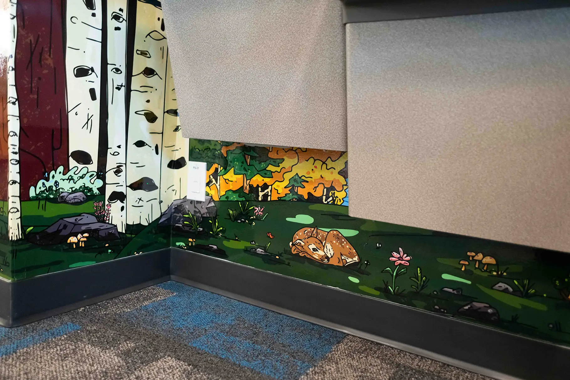 "Working with this artist was always professional with excellent communication. This commission was for a very public space in the children's area of the Clifton library. The details went beyond the artistic work to measuring space and incorporating the artwork around interactive elements. It's essentially a museum exhibit. I love it when kids show me things they have found in TJ's art!"